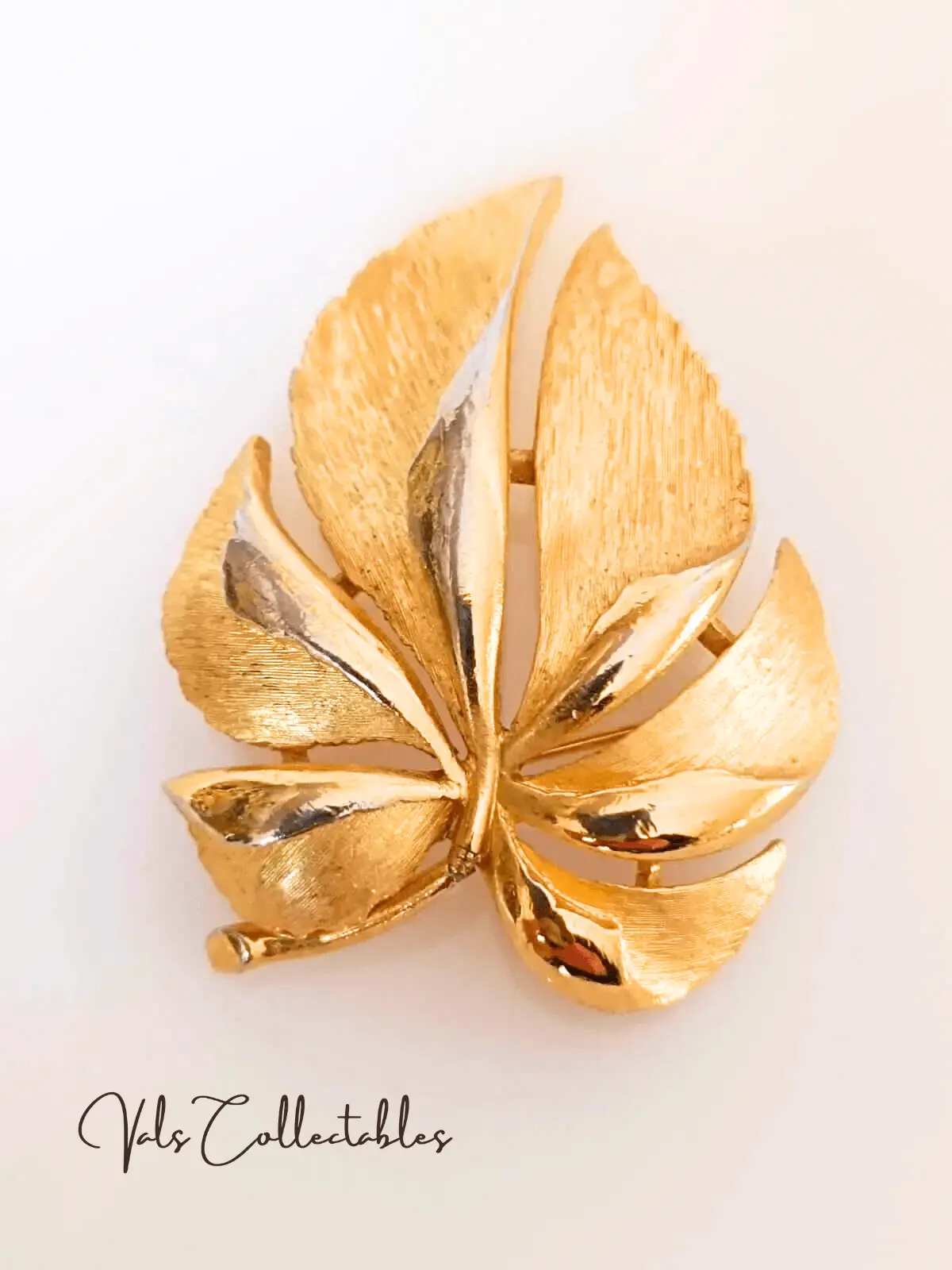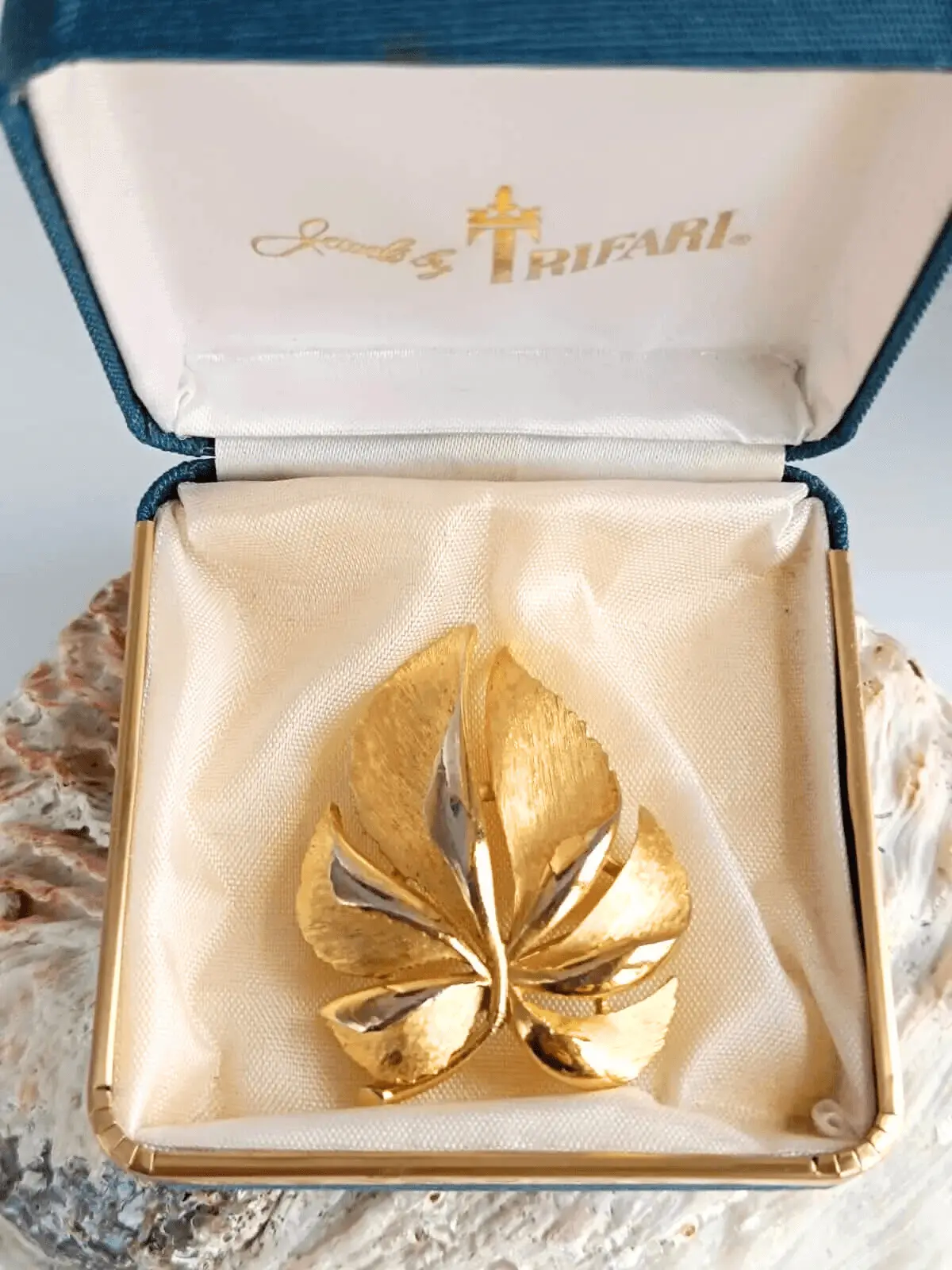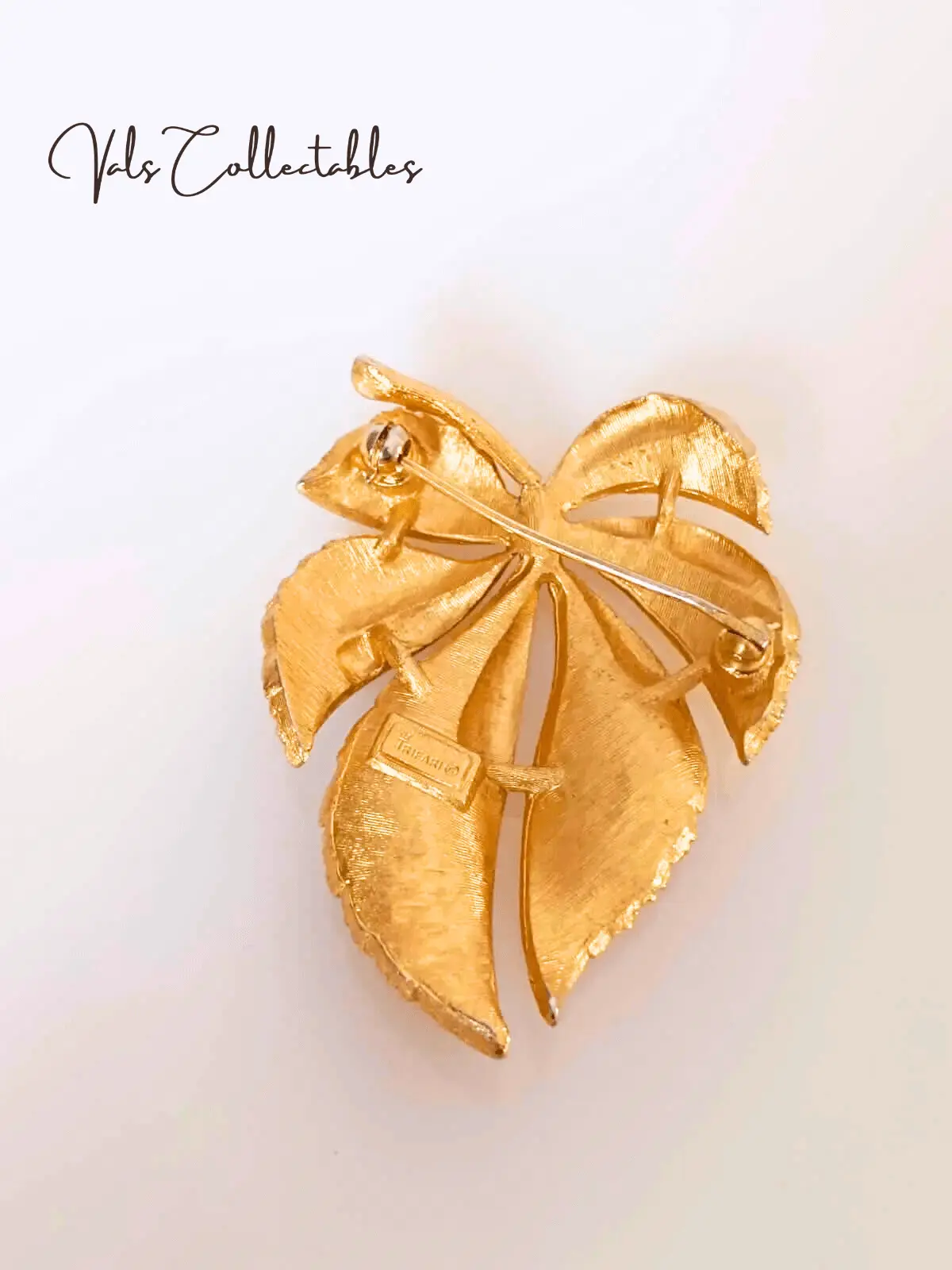 Vintage – 1960’s – Crown Trifari brushed gold tone leaf brooch