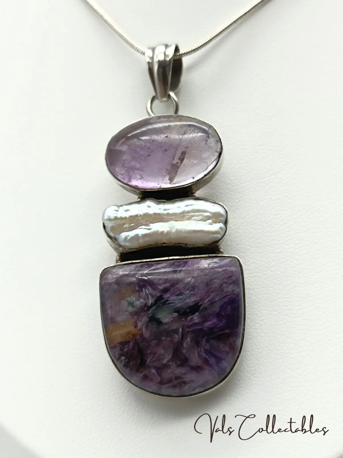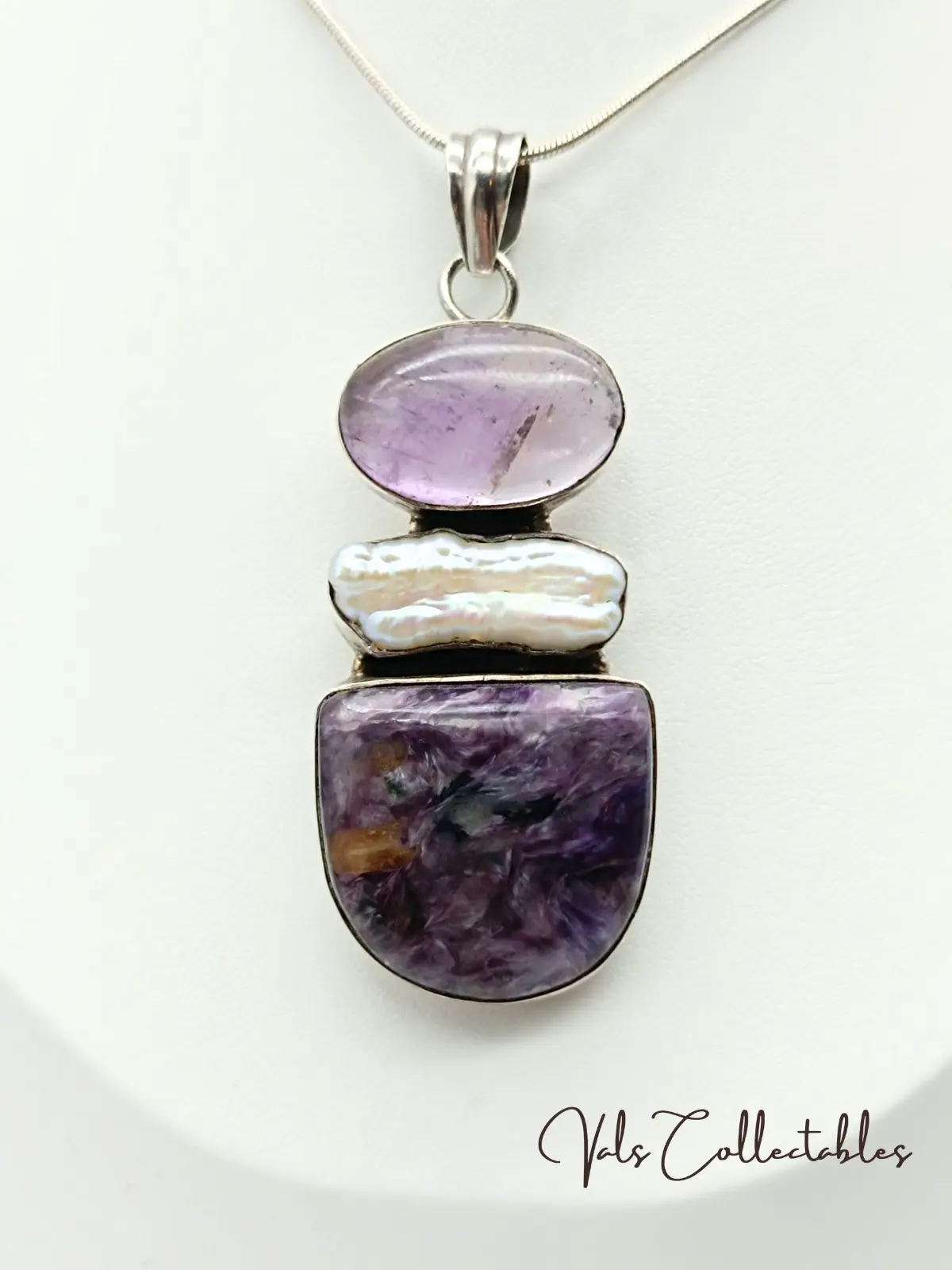 925 Silver Mother of Pear Amethyst Charoite Bezel Set Pendant