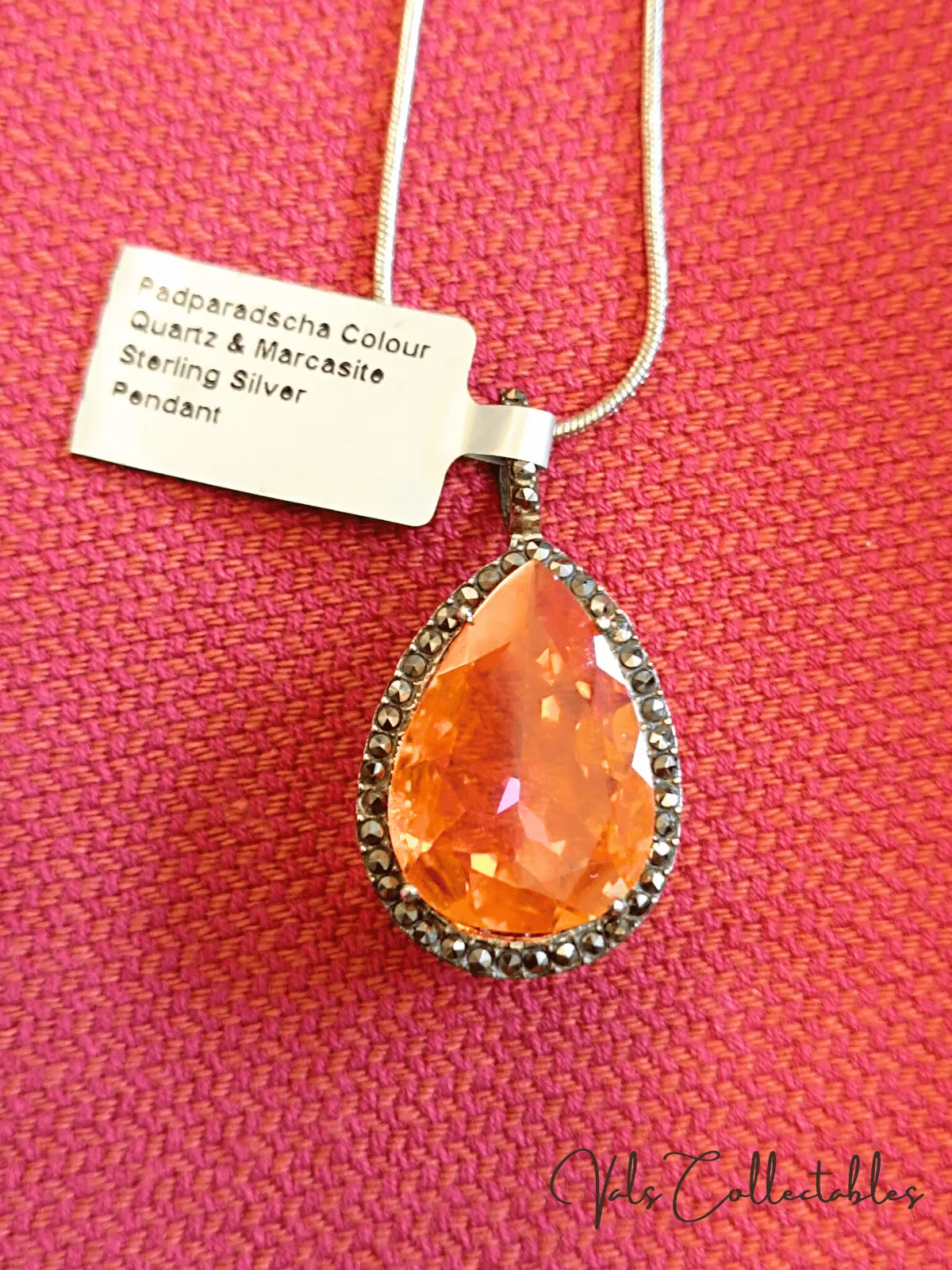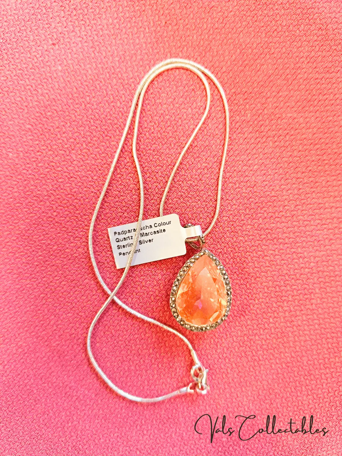 Padparadscha Colour Quartz and Marcasite – Sterling Silver Pendant – 3.4cms including bale x 2cms – 4.2g .