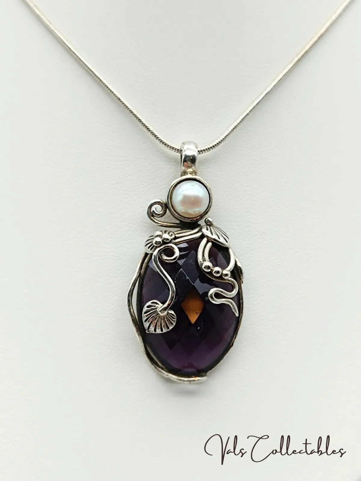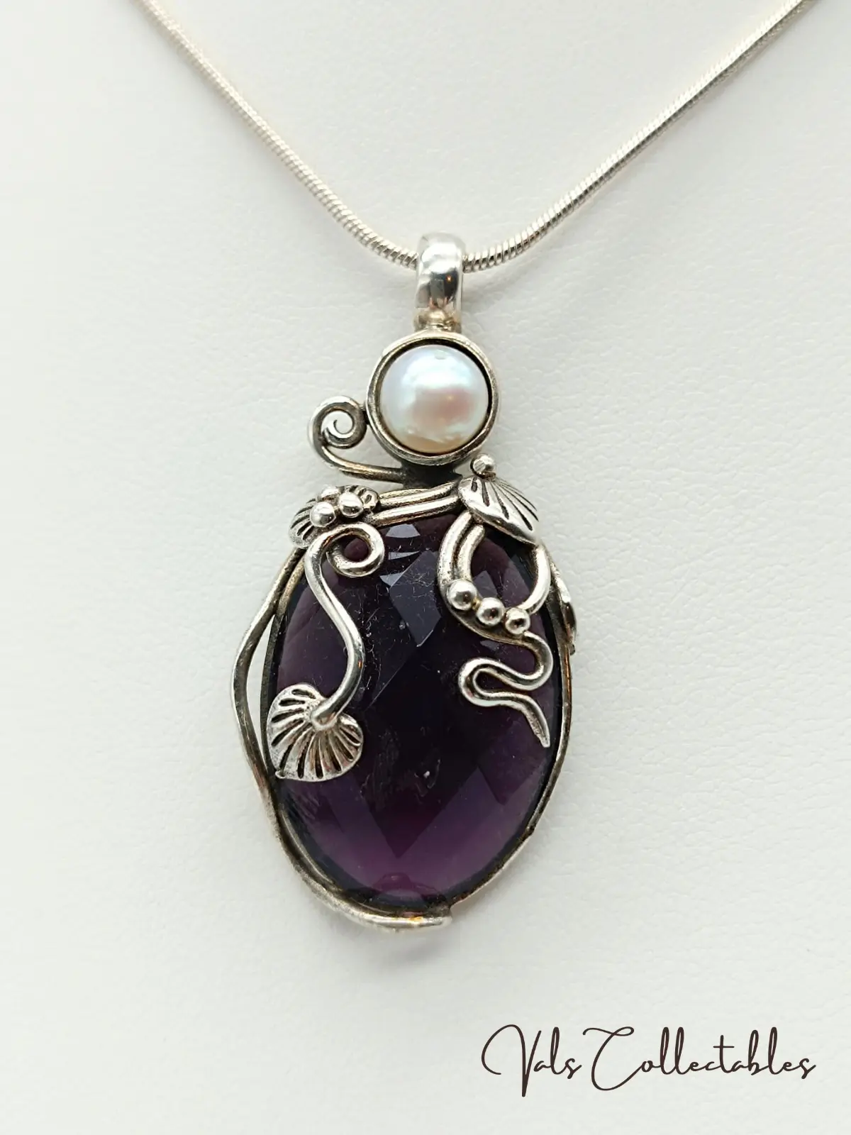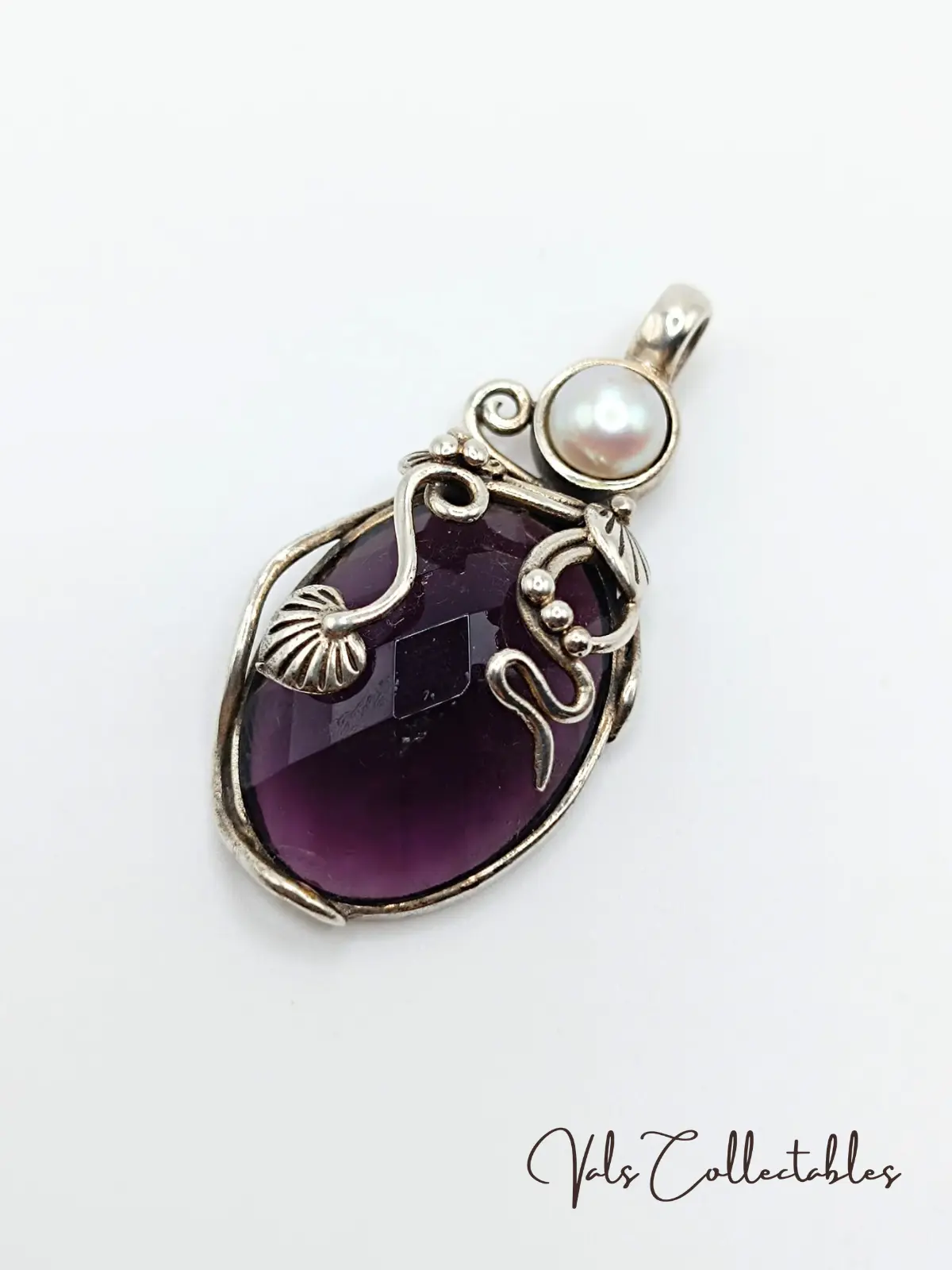 925 Sterling Silver Amethyst & Pearl Art Noveau Style Pendant