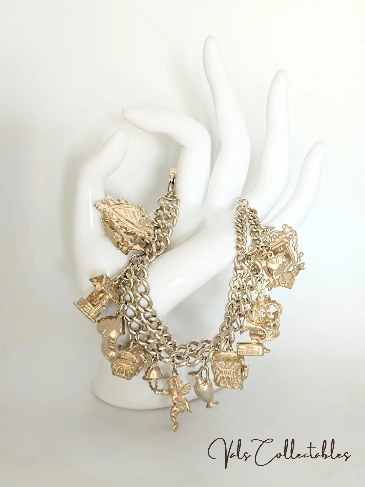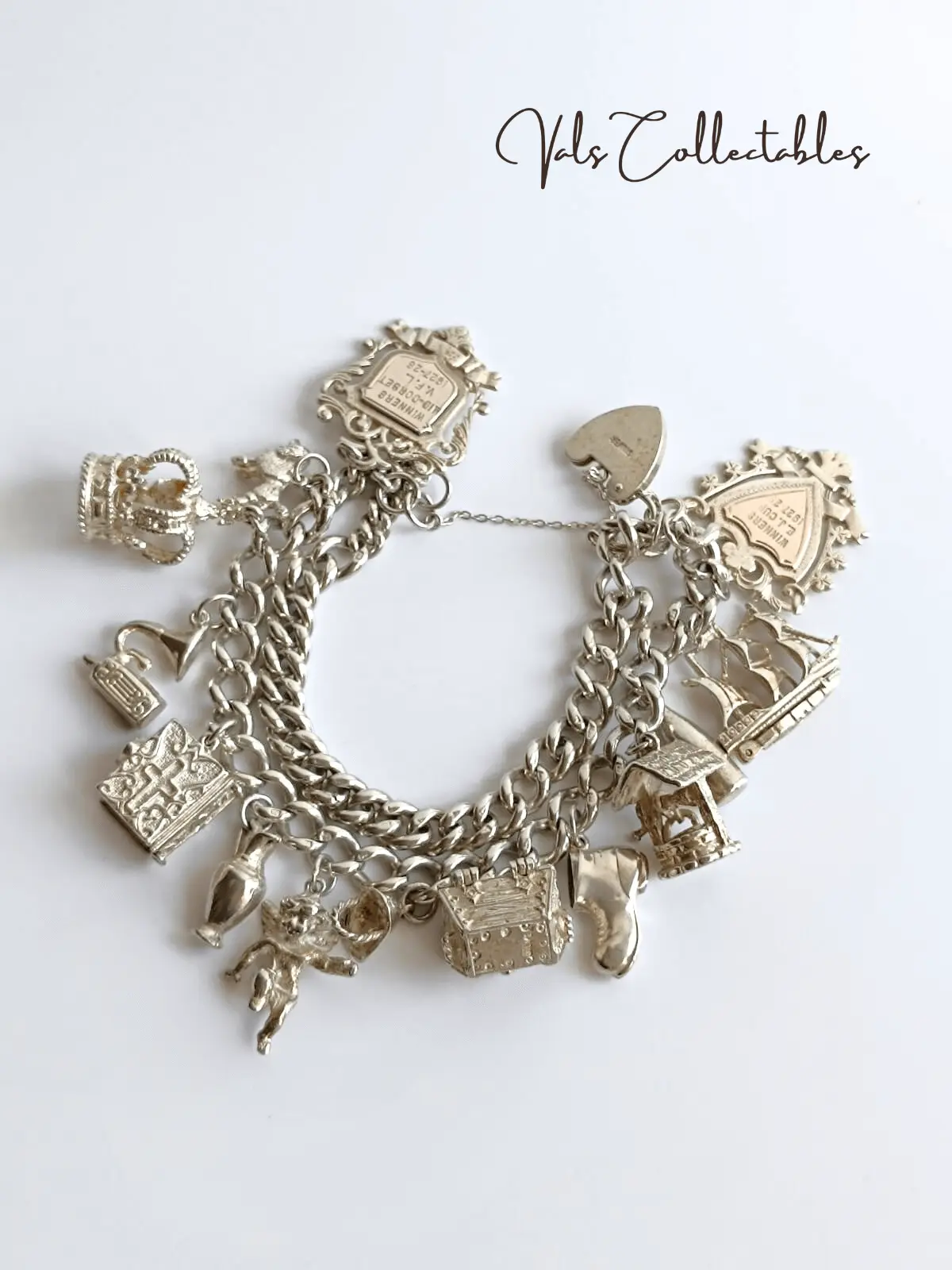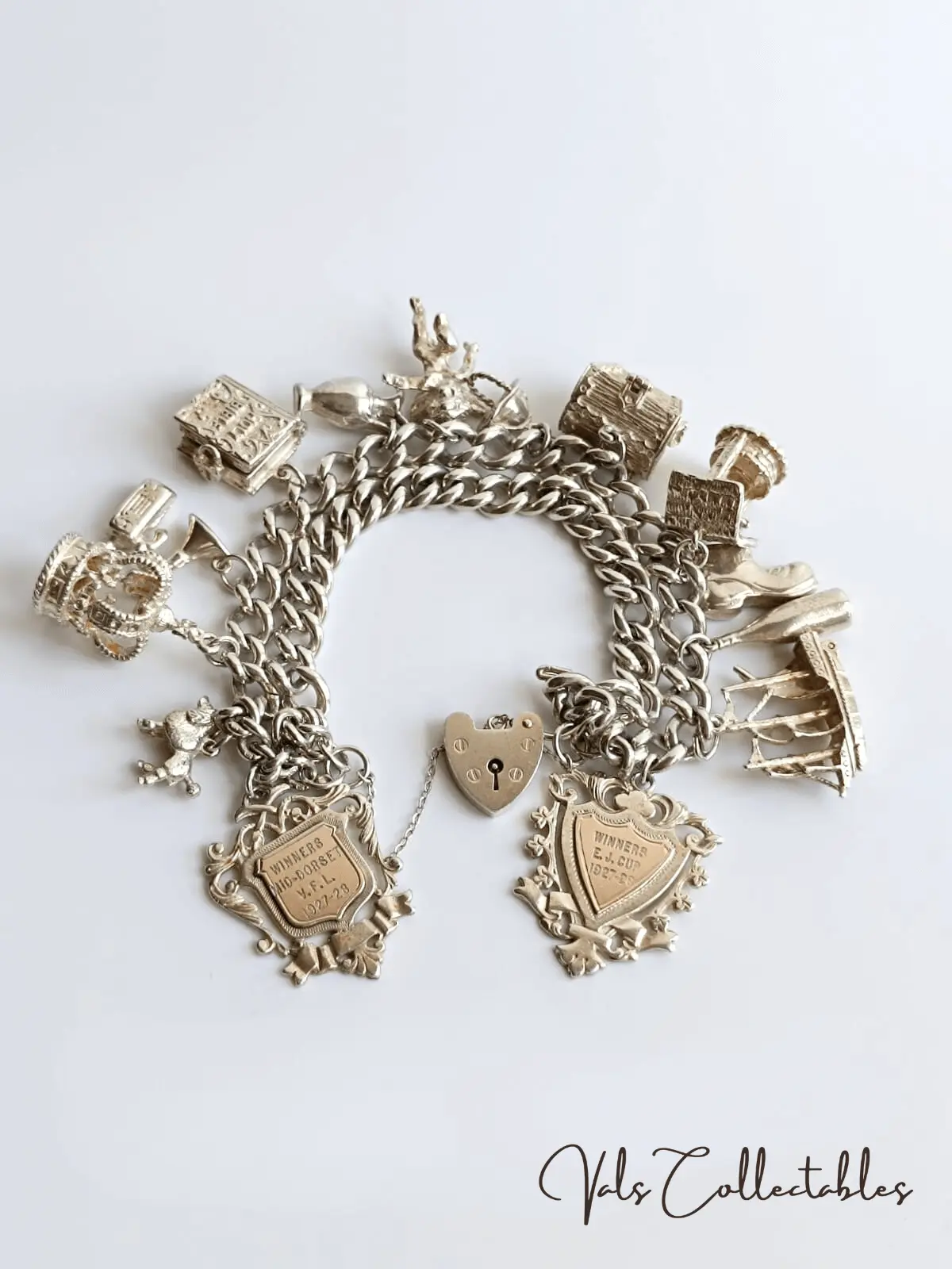 Vintage Sterling Silver Charm Bracelet – 12 Silver Charms & 2 Silver Medals – Winners Mid- Dorset VFL 1927-28 + Winners EJ Cup 1927-28